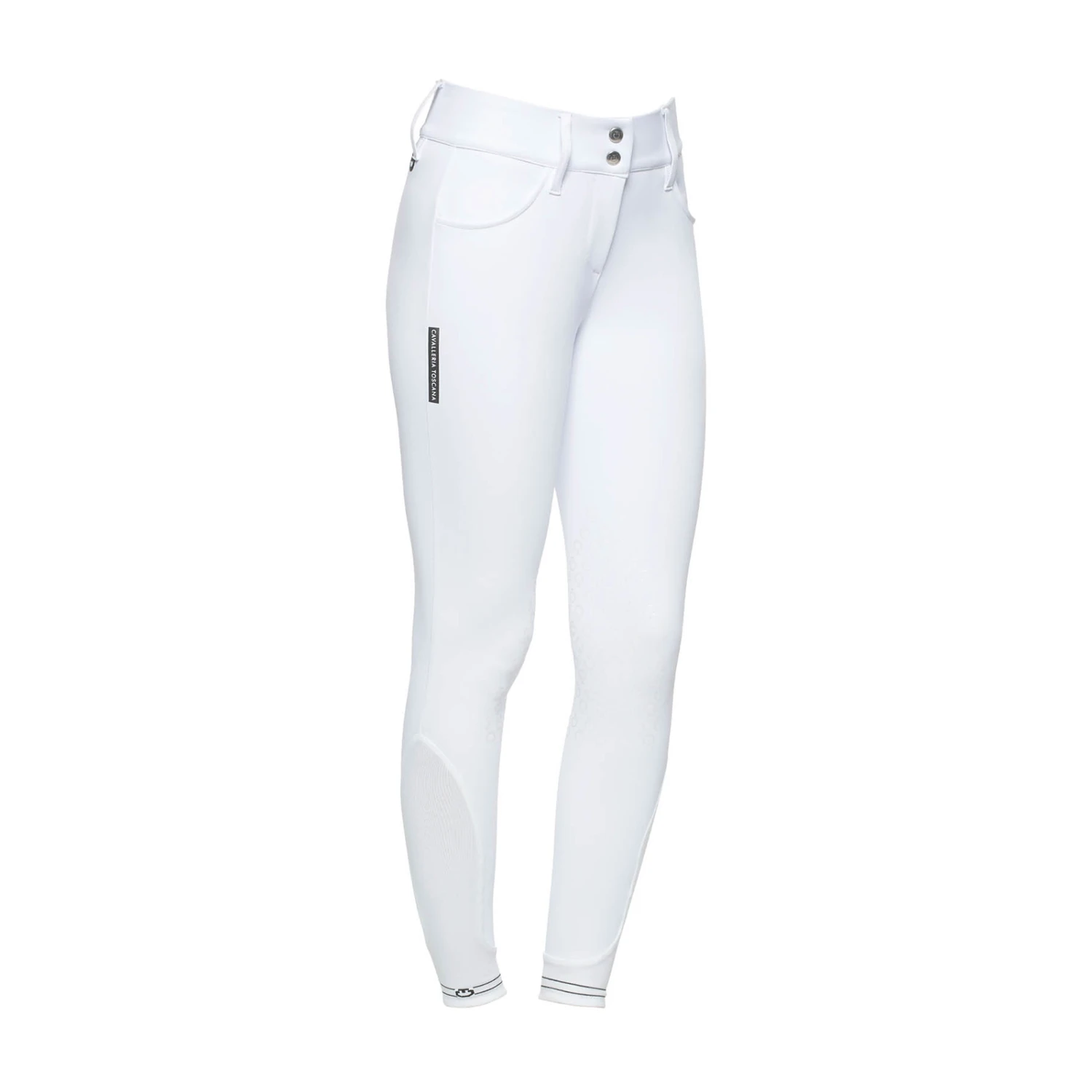 The 4-way stretch technical piqué used for this riding breeches provides maximum breathability and freedom of movements: this fabric adheres perfectly to your body, without constriction. The high-waisted band comes with an internal grip, wich provides the right fit over your shirt. It also features wide belt loops to accomodate your riding belt. The transparent knee grip allows the right stability, while the stretch-knit socks fit comfortably under your boots. The breeches are refined by a perforated logo tape on the thigh.