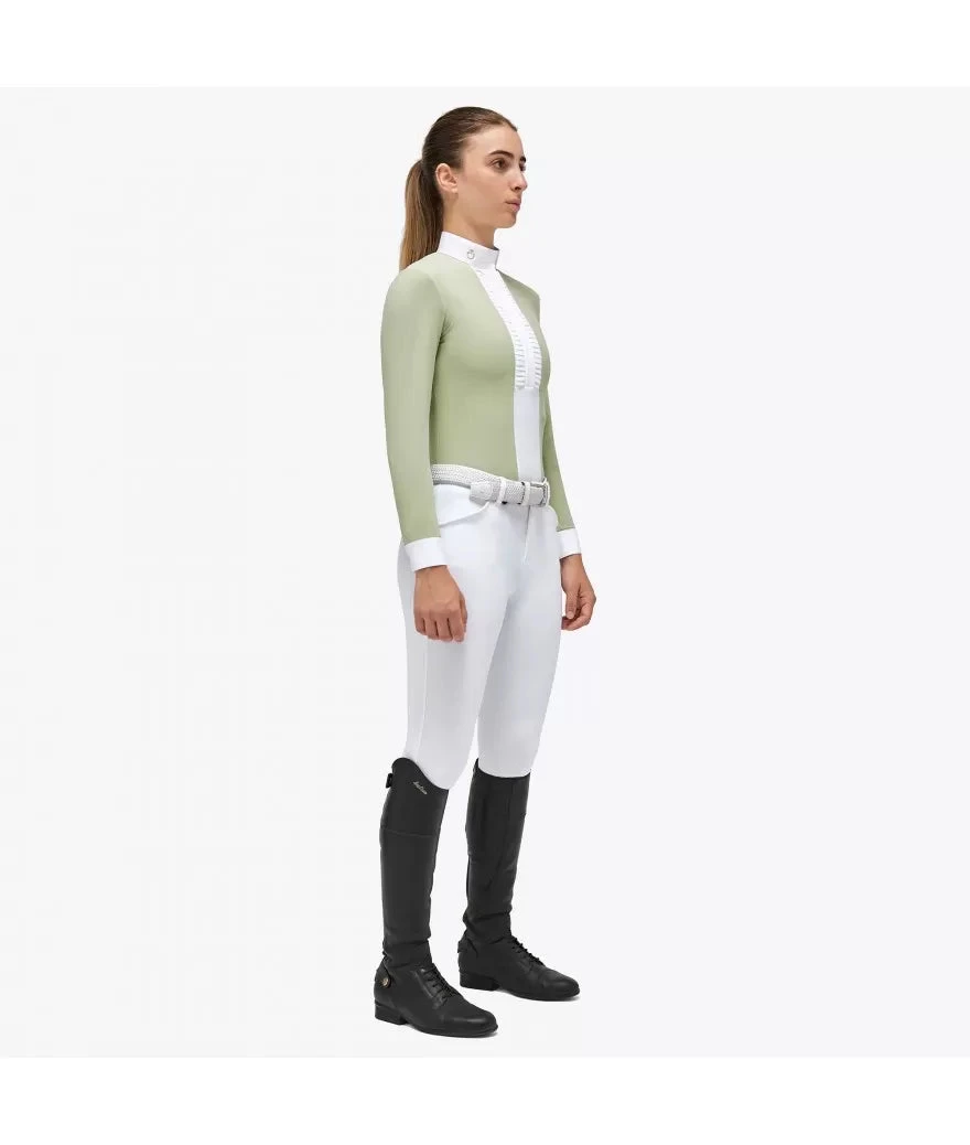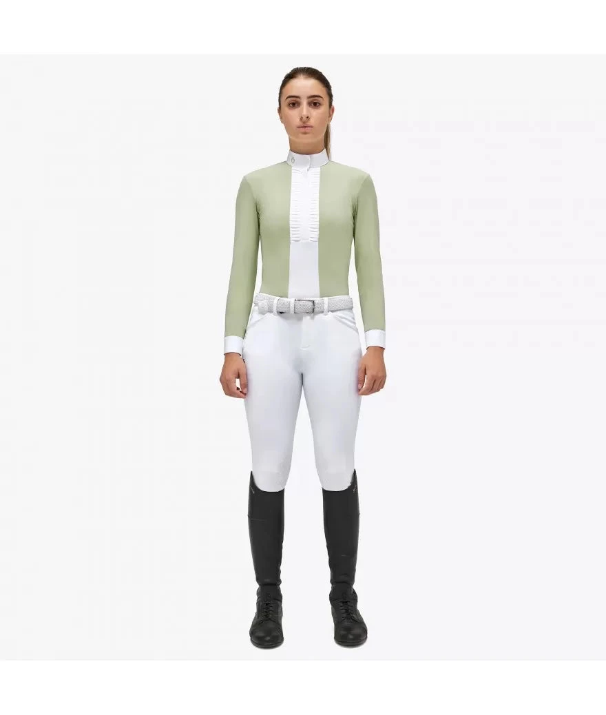 Cavalleria Toscana Pleated Competition Shirt for Girls is made with luxury technical fabric that is lightweight, stretchy, and has an elegant feel. The material is moisture wicking, quick drying, and odor controlling. Girls Cavalleria Toscana equestrian show shirt has a slim fit, classic white collar, and white cuffs. Lovely and refined CT Pleated Competition Shirt has a crisp, professional look that’s perfect for young riders who also appreciate riding comfort.