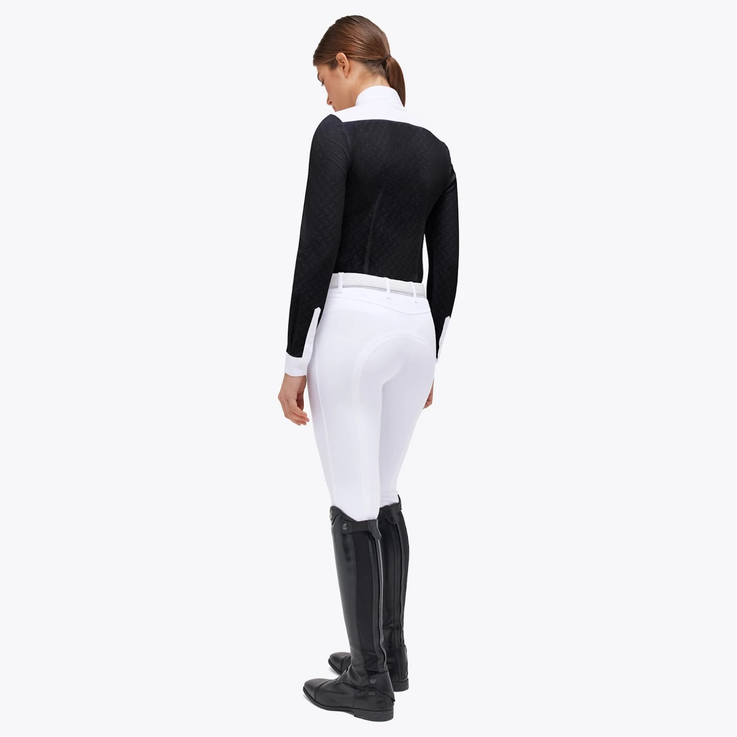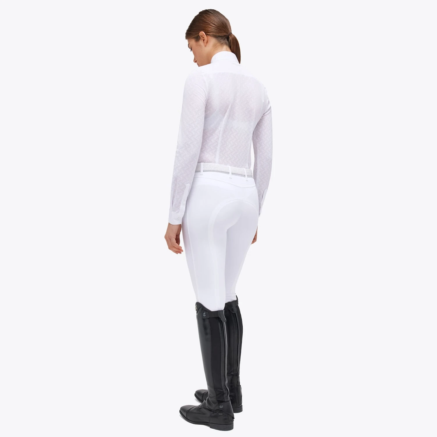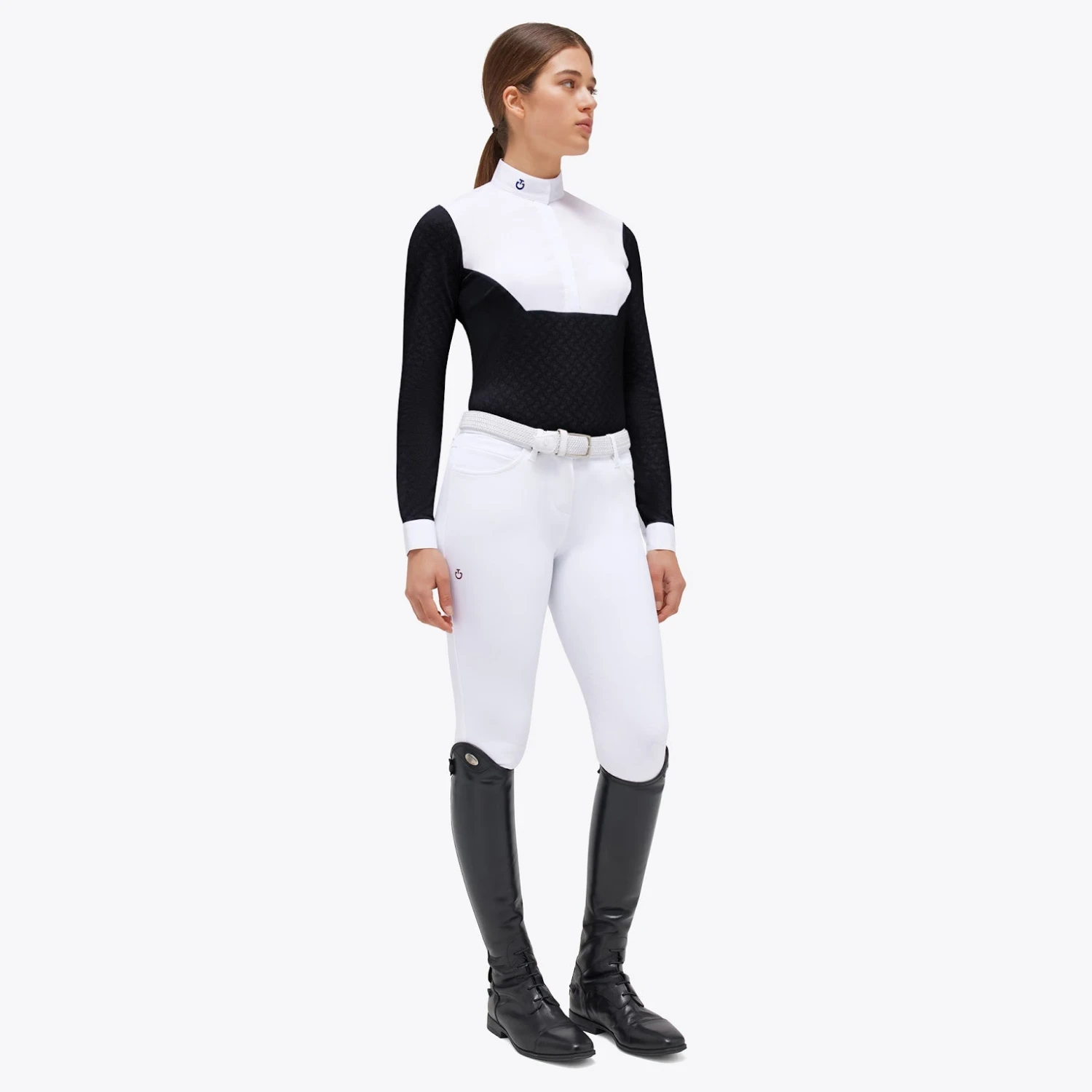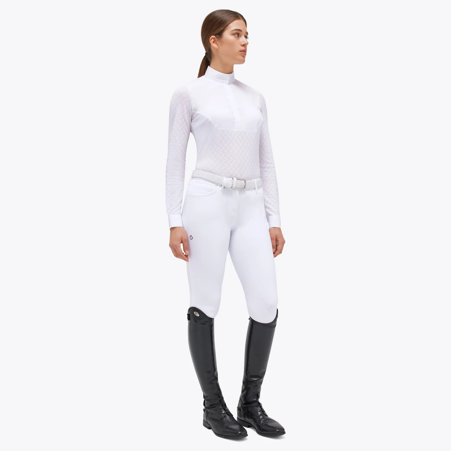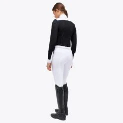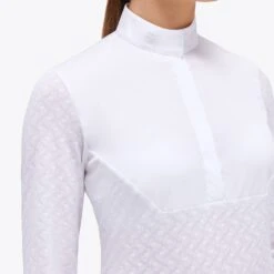 CT Long-Sleeved See-Through Jacquard Jersey Competition Shirt with Poplin Bib is a stylish and practical choice for women who want both fashion and function. The transparent jacquard fabric adds a modern and feminine touch, while the white poplin bib and accents on the collar, cuffs, and mock cuffs bring classic elegance to the design. The hidden snap buttons on the collar ensure a secure fit and a neat look, and the four-hole buttons, subtly concealed on the front, maintain a clean and sophisticated appearance. The cuffs feature visible, four-hole white buttons, which add a distinctive touch to the shirt. The meticulously embroidered CT logo serves as a mark of quality and attention to detail. Whether you’re a rider seeking an elegant, comfortable, and high-performance garment, this shirt is the perfect choice.