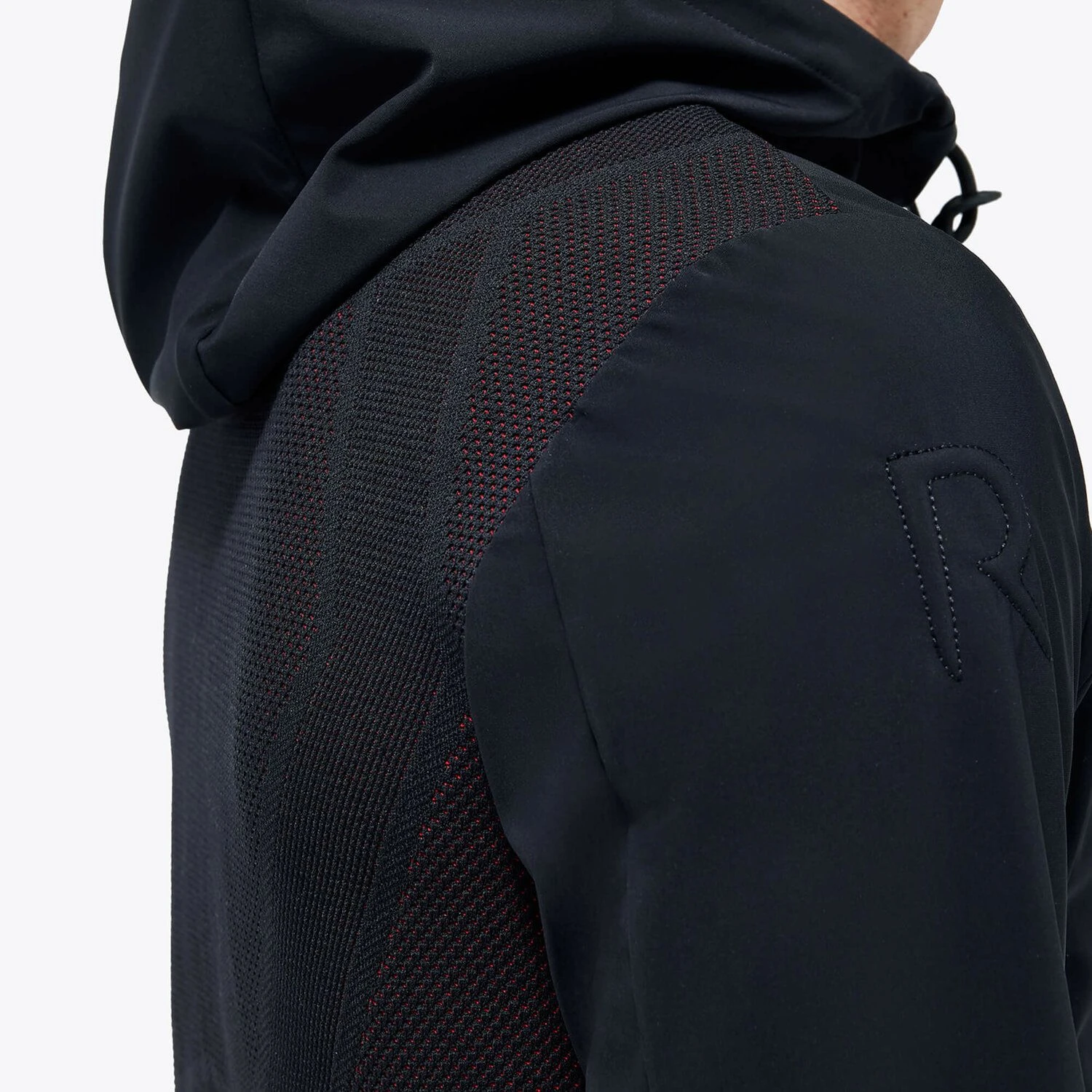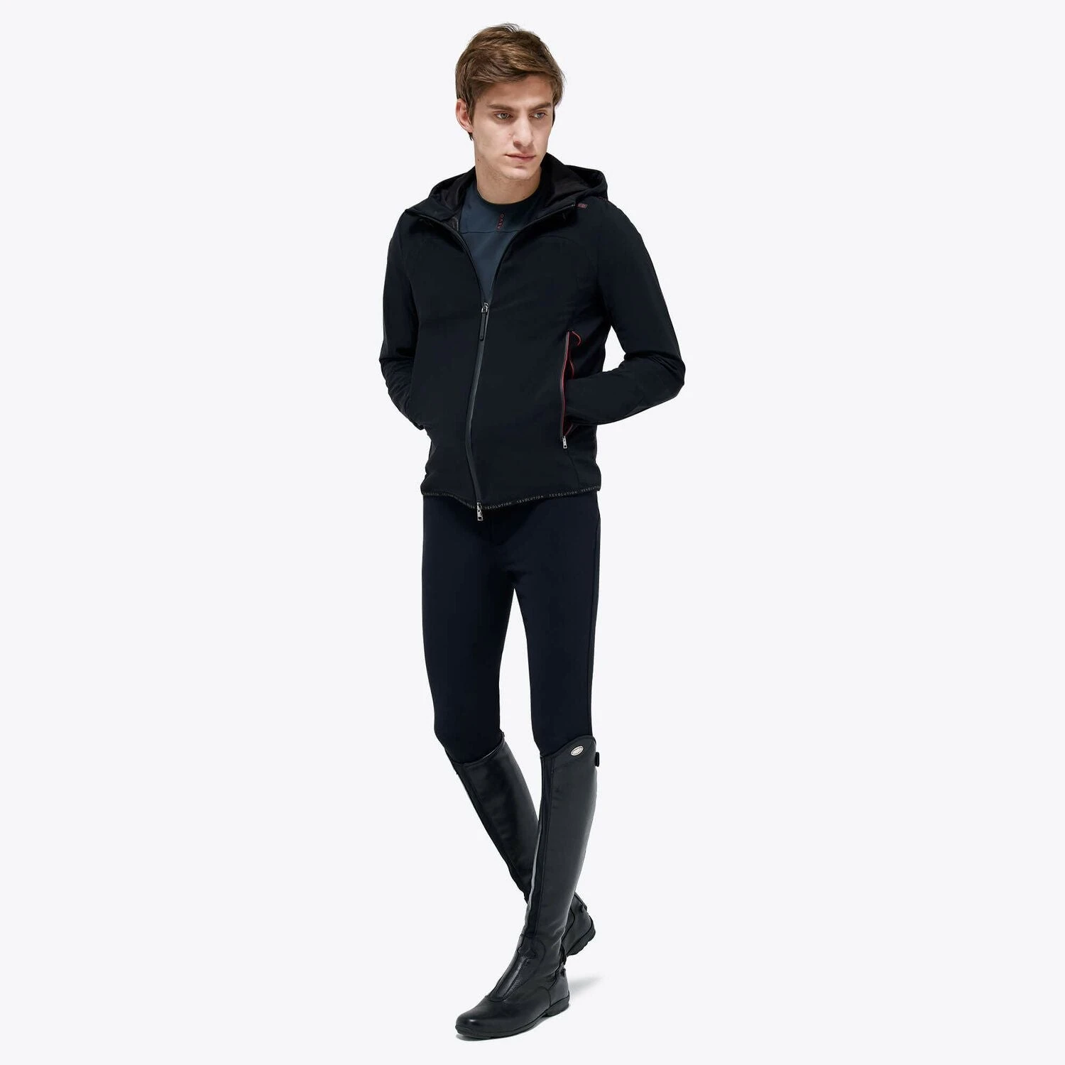 A technical, high-performance jacket designed for outdoor activities and riding. The model is made of REVO softshell and features a breathable, waterproof and windproof inner membrane with a technical knit back. The adjustable hood, pockets and closure with heat-taped zips provide additional insulation. The logo trims and REVO details on the shoulders convey a bold graphic edge.