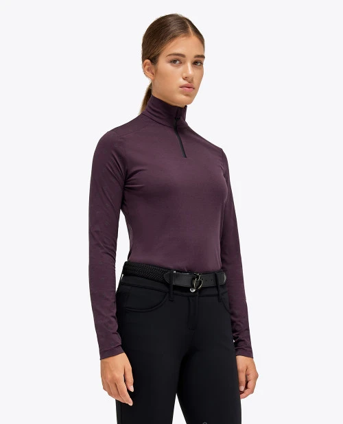 The soft technical fabric is breathable, wicking, and quick drying. The CT Mini Flock Quarter Zip Top helps maintain warmth without being heavy or bulky. Wear it for its excellent athletic features while training or exercising then enjoy it as beautiful leisure wear to double its wardrobe value. Ladies cold weather horseback riding top has a quarter zip closure with signature CT logo pull. The lovely Dark Purple and Brown colors both have black accent trim. The Cavalleria Toscana Mini Flock CT Print Quarter Zip Top is the perfect chic base layer to add to your winter equestrian outfits.