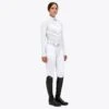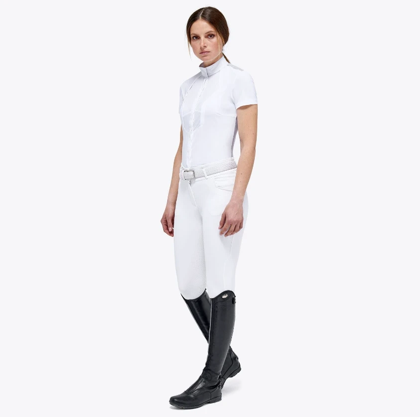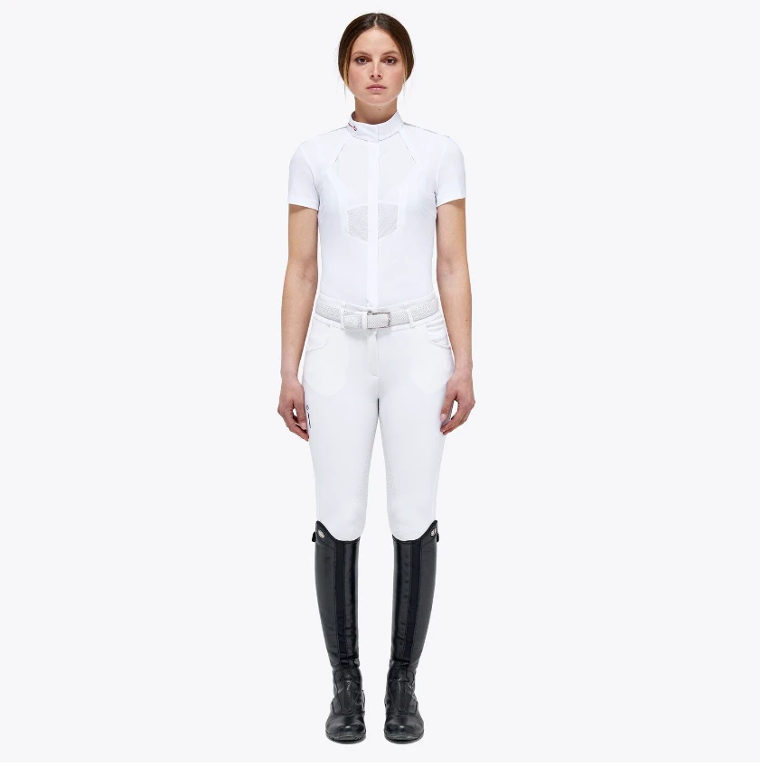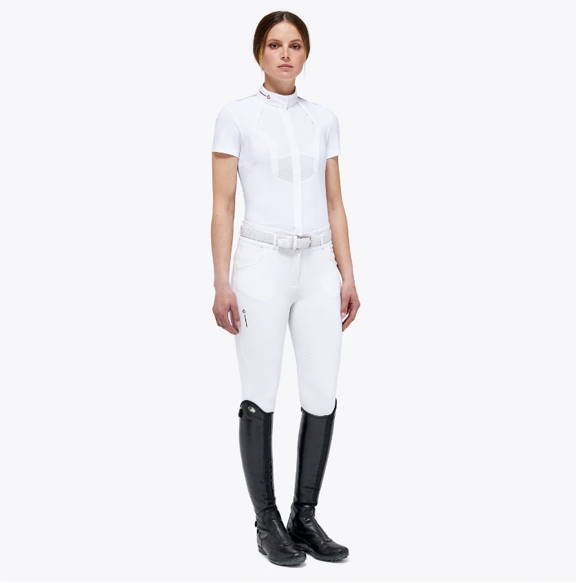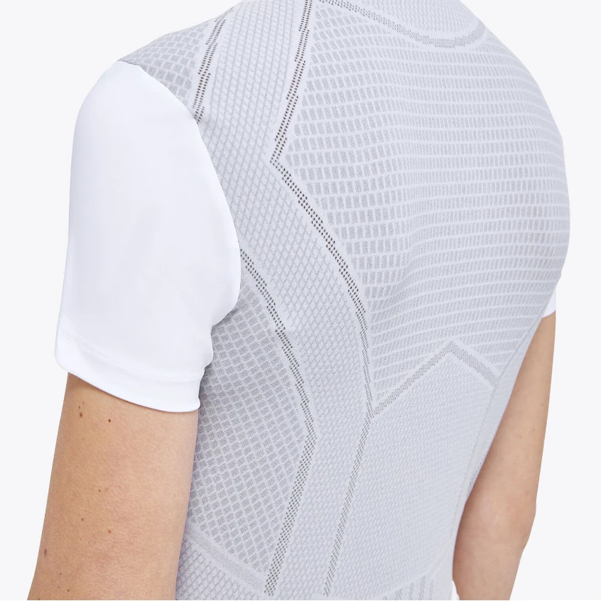 Feminine design, innovative details and a combination of different fabrics that offer both elegance and performance at the same time. The slim fit of this competition shirt accents the silhouette, short sleeves ensure maximum freedom of movement, and the stand-up collar with an embroidered CT logo adds a distinguished touch. The front is made of poplin with a geometric inlay on the bib, while the back is finished in REVO technical jersey that lends breathability, absorbs perspiration and leaves the skin feeling cool and dry at all times.
