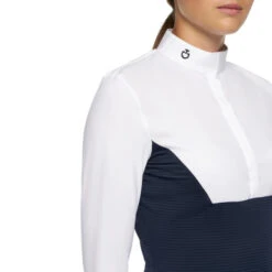 Cavalleria Toscana Seersucker Poplin Bib Shirt with long sleeves has the classic elements needed for showing plus lightweight seersucker for fresh style. Women’s equestrian show shirt has a cotton poplin bib, cuffs, and show collar. The body of the shirt is seersucker in contrast dark blue or light blue color. The sleeves are silky white jersey.