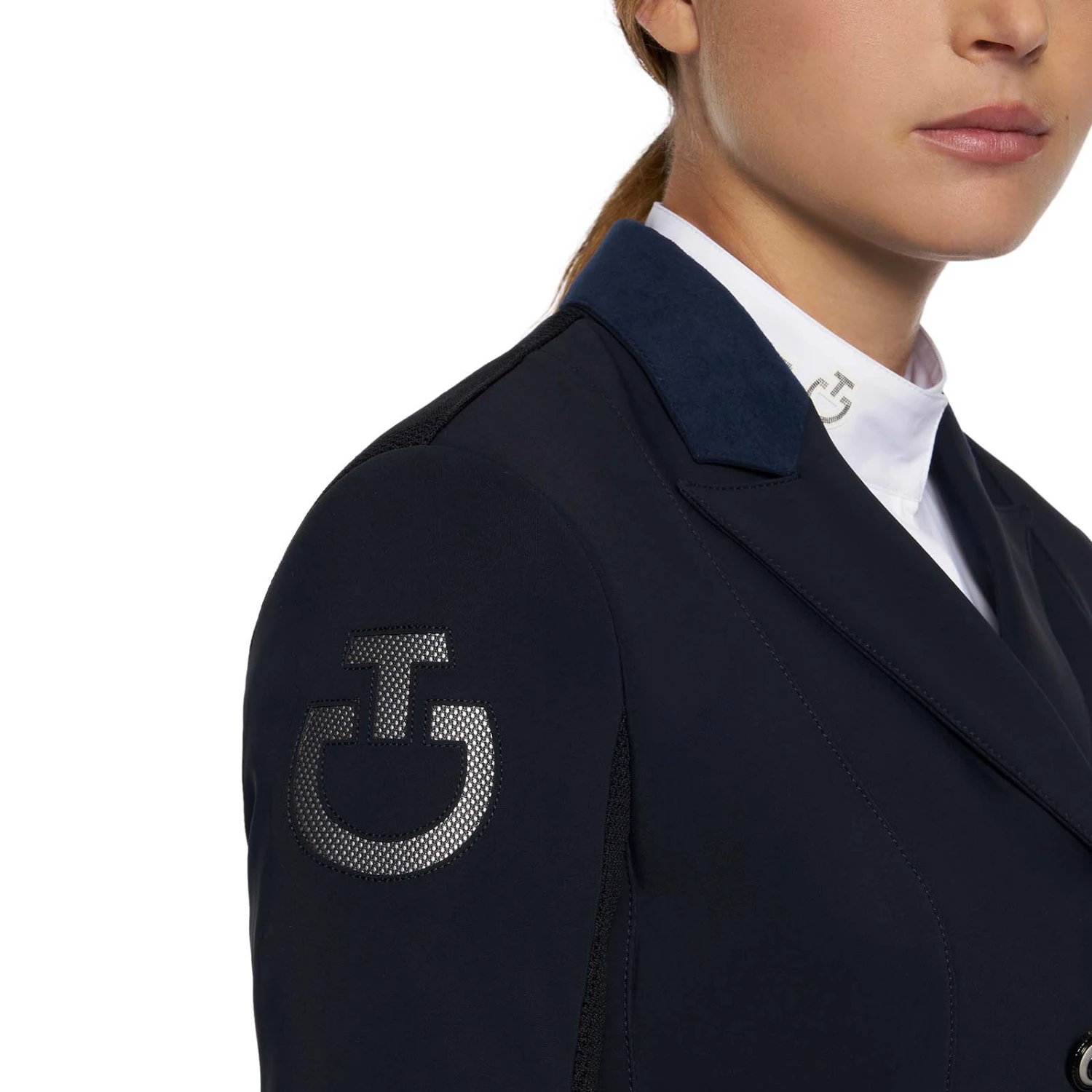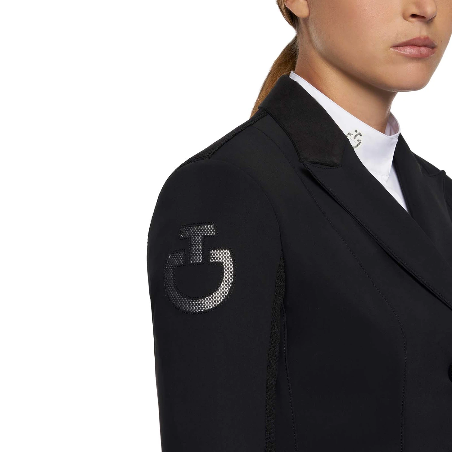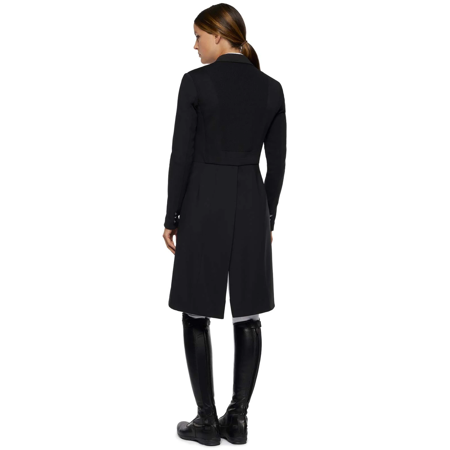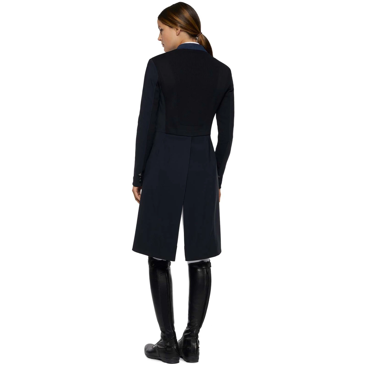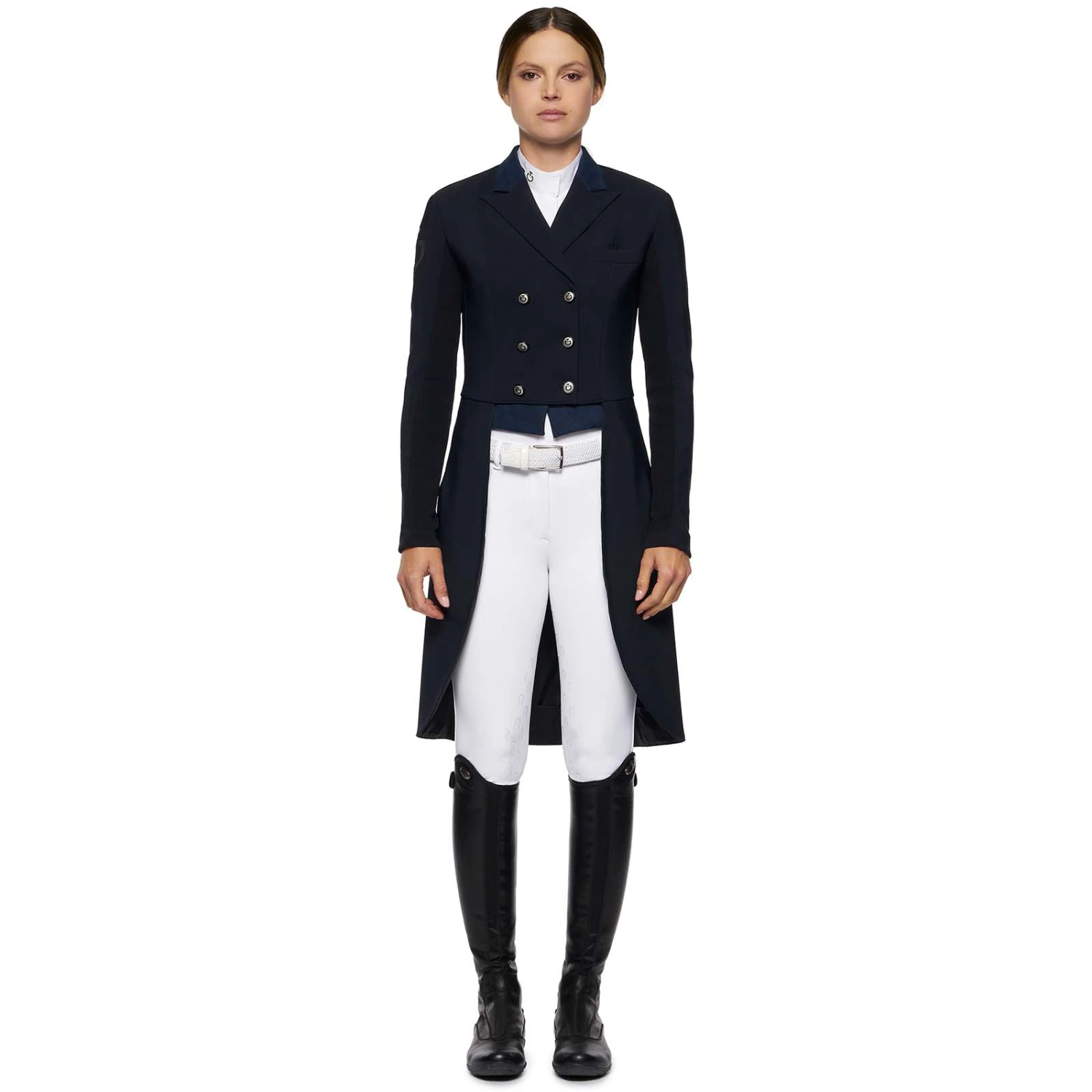 This women’s riding tailcoat combines elegance and performance. The highly breathable and water repellent technical 4-way stretch fabric follows trough your movements without constriction. The fabric also provides antibacterial properties and UV protection, ideal for sports activities. The tailcoat is refined by alcantara collar, piping and points, while the metallic buttons are refined by a logo. Bottom tails include removable weights for greater stabilty and elegance during performance. The look is completed by a functional front pocket and an embroidered logo on the shoulder.