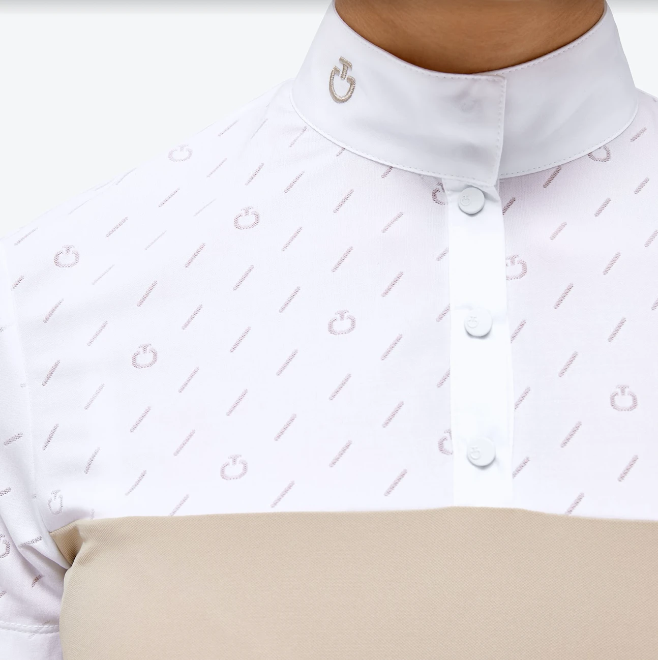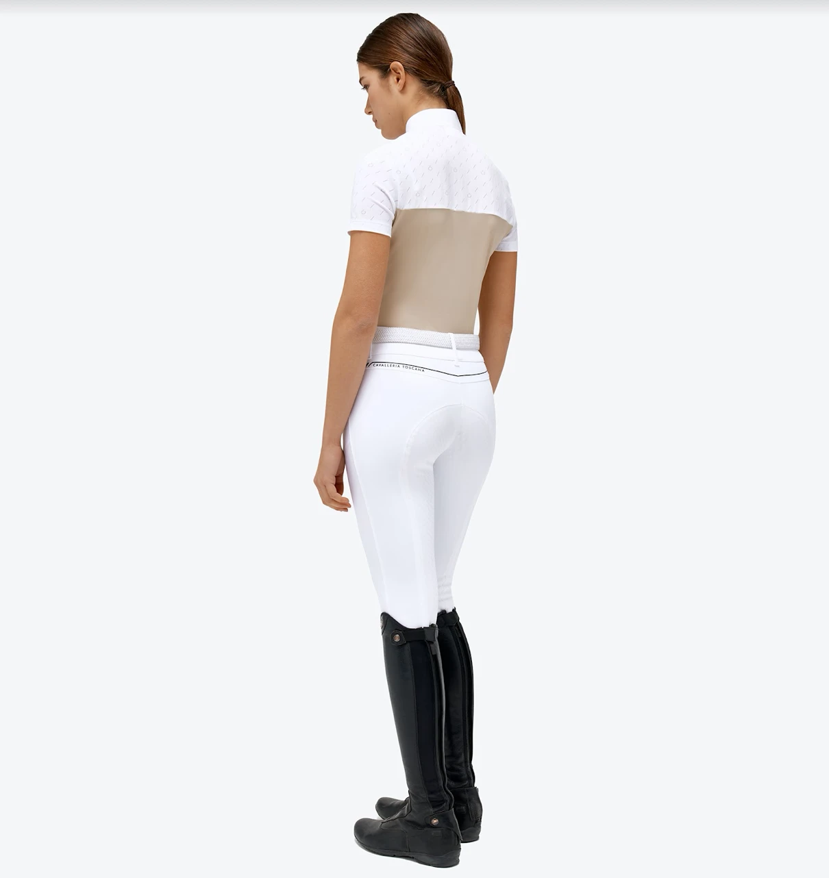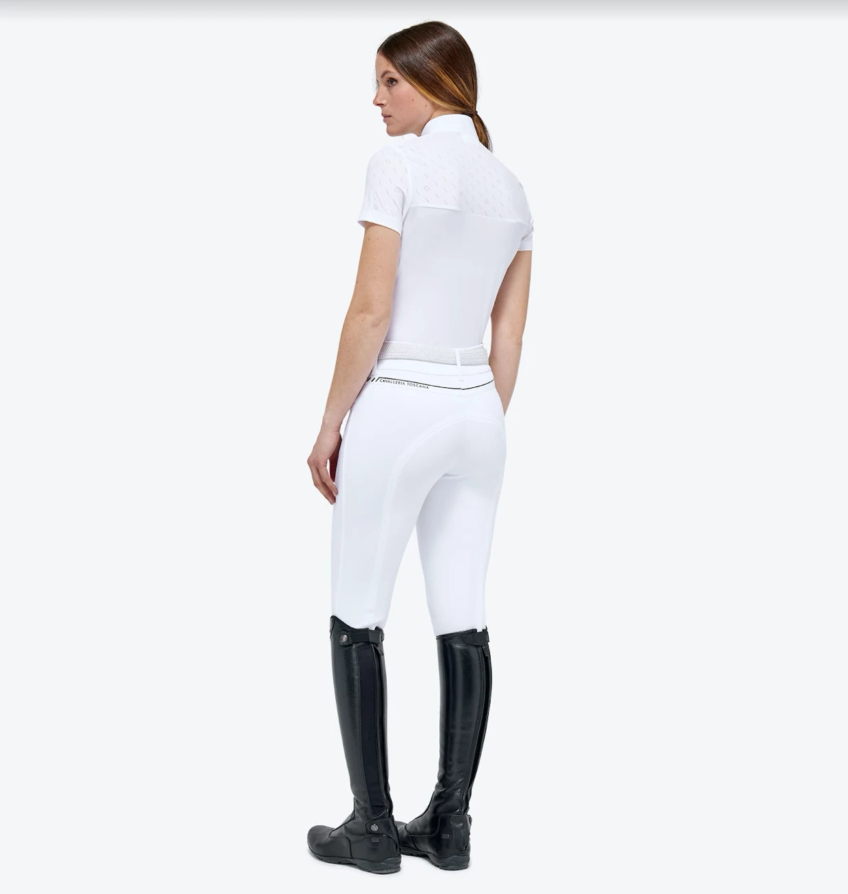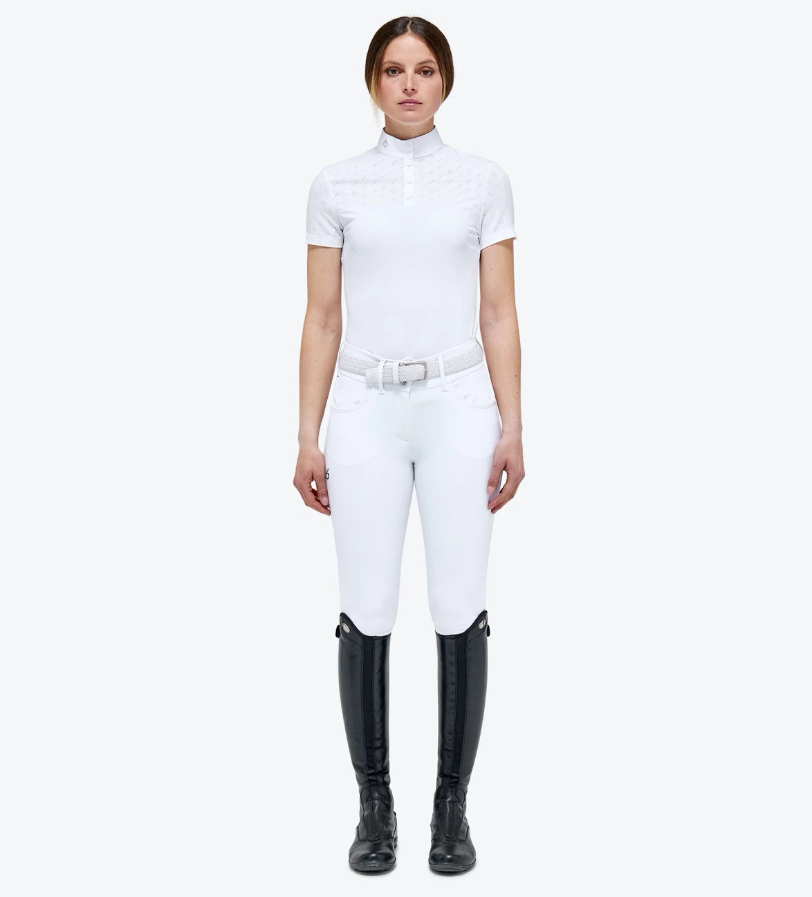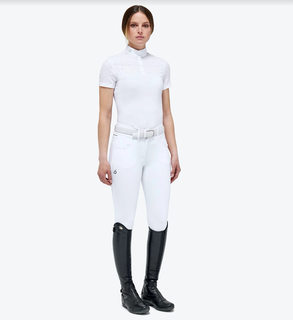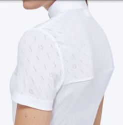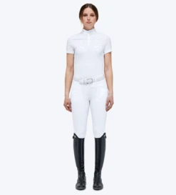 Women’s CT Short Sleeve Competition Polo – Designed for riding shows, this polo shirt represents Cavalleria Toscana’s heritage combined with functional, modern design. The model boasts a slim, feminine style that enhances the waist and is made of sumptuous cotton piqué that feels soft against the skin. The yoke and short sleeves are finished with tone-on-tone technical jersey and an all-over jacquard CT monogram. The button fastening and high collar with our iconic embroidery on the side complete the look.