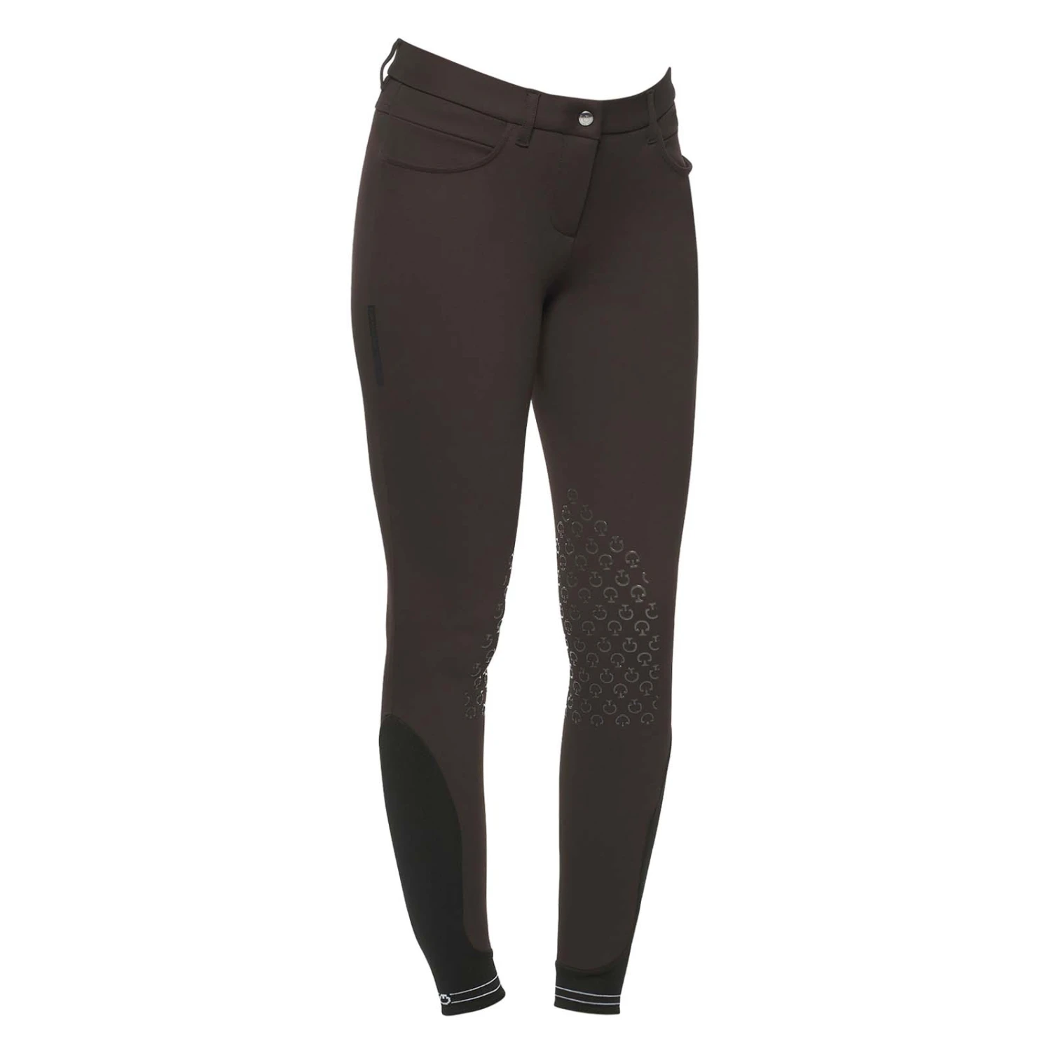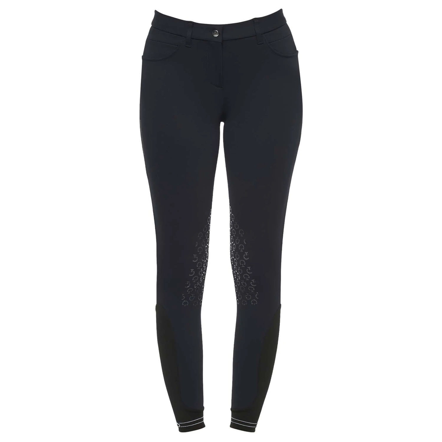 The women’s riding breeches are made from technical piqué, wich sustains the muscles during the performance and provides benefit to the recovery fase. The fabric adheres perfectly to the body, following through your movements without constriction and providing high comfort and breathability. The material provides UV protection during outdoor activity ad is extremely durable for frequent use and washing. The breeches feature a transparent knee grip, two front pockets and a button fastening. They are refined by a perforated logo tape on the thigh. The stetch-knit socks are refined by a small logo.