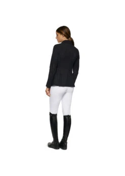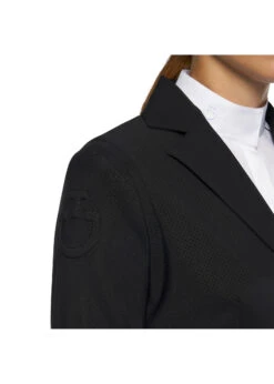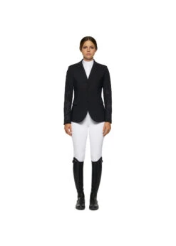 This women’s classic riding jacket is made from light technical 4-way stretch perforated jersey, which is both elegant and high performing. It is breathable and follows your body movements, while providing antibacterial properties and water repellence. The jacket features an alcantara collar, two front pockets and buttons fastening. The seam-lines on the back flatter your figure while keeping the flexibility. The jacket is refined by an embroidered logo on the shoulder.